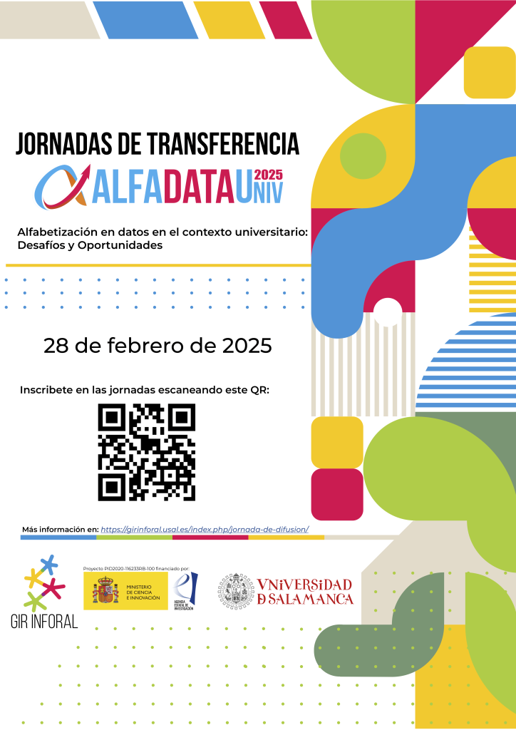 Con el fin de crear un espacio donde reflexionar y compartir inquietudes y experiencias sobre los desafíos y las oportunidades que ofrece el universo de los datos y sus distintos paradigmas (big data, datos abiertos, datos de investigación, etc.), el Grupo de Investigación Reconocido en Inclusión, Innovación, Formación Docente y Alfabetización Informacional (GIR Inforal) de la Universidad de Salamanca organiza las Jornadas de Transferencia ALFADATAUniv: “Alfabetización en datos en el contexto universitario: desafíos y oportunidades” en el marco del proyecto de investigación Alfabetización en datos en el contexto universitario: detección de necesidades, diseño de escenarios formativos en abierto y elaboración de un referencial de competencias (ALFADATAUniv), financiado por el Ministerio de Ciencia e Innovación (PID2020-116233RB-100).