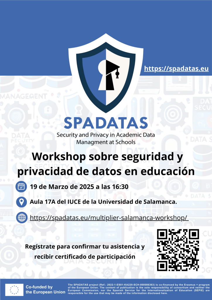 El próximo 19 de Marzo a las 16:30 tendra lugar en el IUCE el workshop “Seguridad y Privacidad de Datos en Educación” del proyecto SPADATAS. Está dirigido a profesores, futuros docentes y cualquier persona interesada en la protección de datos en entornos educativos. Su objetivo es proporcionar herramientas y estrategias para garantizar un uso seguro y ético de los datos en el ámbito educativo, alineado con las mejores prácticas desarrolladas en el marco del proyecto SPADATAS. Durante la sesión, se presentarán recursos clave como el Handbook of Good Practices, el buscador de buenas prácticas, la herramienta de autoevaluación y el buscador de recursos educativos. Los participantes podrán explorar casos prácticos, evaluar su nivel de conocimiento sobre privacidad y seguridad, y discutir estrategias para aplicar estas prácticas en sus contextos educativos.