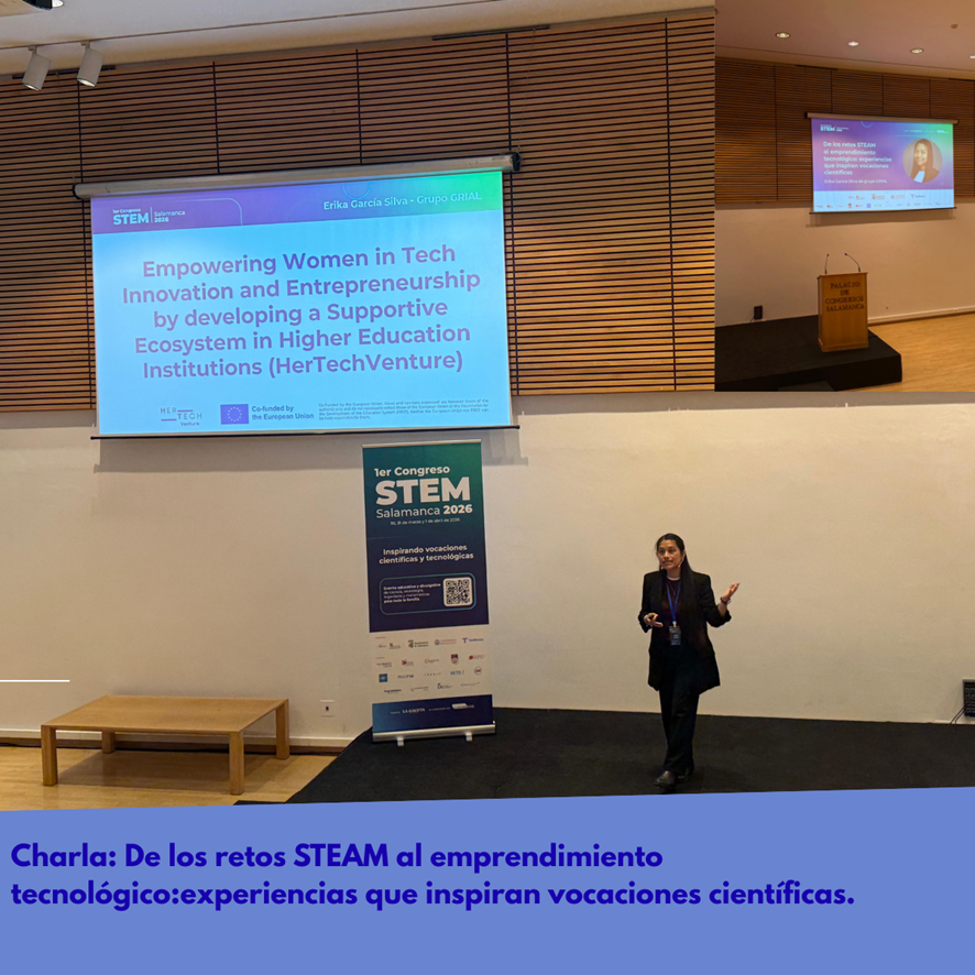 La investigadora Erika García-Silva, miembro del grupo de investigación GRIAL, participó como ponente en el 1er Congreso STEM de Salamanca, donde dio a conocer tres iniciativas del grupo centradas en promover la equidad en STEM: Retos-Indigenius:Inspirando futuros STEM, HerTechVenture y Migrantes en STEM: Voces y Experiencias.